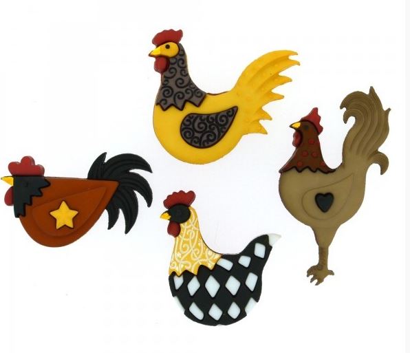 Dekorační knoflíčky s motivem slepiček. Balení obsahuje 4 ks. Vhodné pro scrapbook a další dekorace, např. dozdobení oblečení, šitých projektů, šperků.