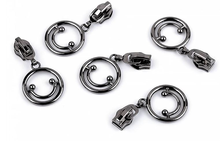 Kovový jezdec s táhlem v podobě kroužku je určený ke spirálovým zipům o šíři 5 mm v metráži. Průměr kroužku je 20 mm.