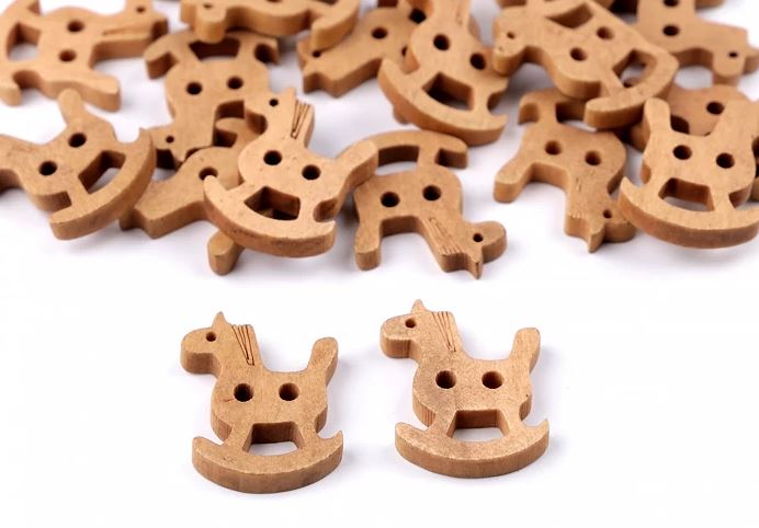 Dřevěné dvoudírkové knoflíky mají tvar houpacího koníka. Využijete je hlavně ve scrapbookingu na ozdobení rámečků, přáníček, jmenovek, pozvánek či deníků.
