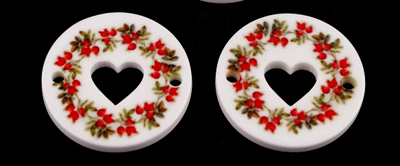 Dvoudírkové knoflíky zdobí výřez srdce a z přední strany zdobené květy. Vyniknou na oděvech, dekoračních polštářích, přáníčkách, pozvánkách apod.