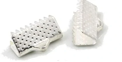 Bižuterní kovová zamačkávací koncovka na stuhy, pásky, řemínky a jiné materiály. Zoubky na vnitřní straně pro pevnější uchycení, očko na vnější pro připevnění zapínání.