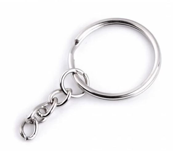 Klíčový kroužek s řetízkem, průměr 25 mm, délka řetízku 25 mm, tloušťka 2,5 mm.