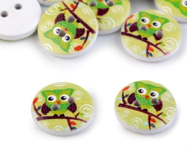Dřevěné knoflíky s potiskem sovy využijete hlavně ve scrapbookingu. Knoflík je možné přilepit lepidlem, oboustrannou lepící páskou nebo za pomocí dalších scrapbookingových lepících doplňků. Můžete je použít při výrobě přání, alb, koláží atd.
