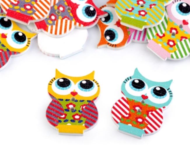 Dřevěné knoflíky s potiskem sovy využijete hlavně ve scrapbookingu. Knoflík je možné přilepit lepidlem, oboustrannou lepící páskou nebo za pomocí dalších scrapbookingových lepících doplňků. Můžete je použít při výrobě přání, alb, koláží atd.