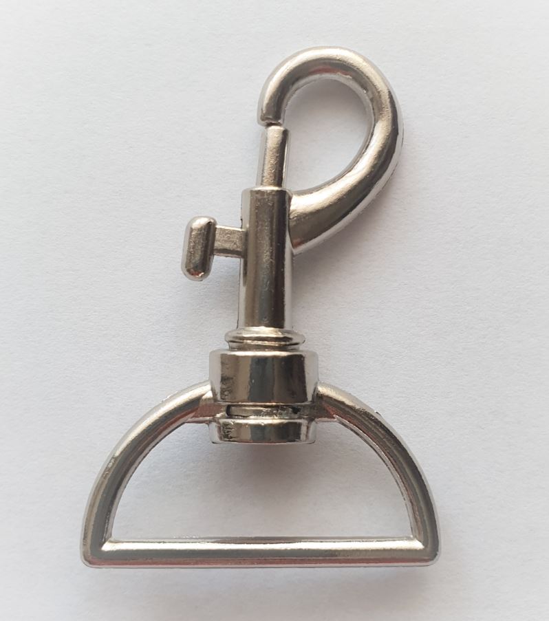 Kovová karabinka v provedení nikl, s otvorem pro popruh 30 mm.