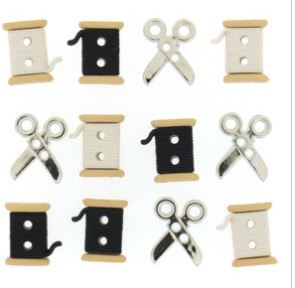 Dekorační knoflíčky s motivem špulek a motivem pomůcek pro švadlenky. Balení obsahuje 12 ks. Vhodné pro scrapbook a další dekorace, např. dozdobení oblečení, šitých projektů, šperků.