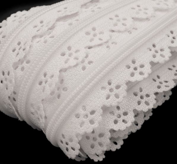 Krajkový metrážový zip 3mm bílý 101Skladem 48 m16,00 Kč/ m13,22 Kč bez DPH