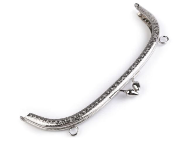 Kovový rámeček se zapínáním je určený na výrobu kabelky. Zapínání má nahoře úchyty na ucha. Rámeček je určený k našití, kdy se látka dovnitř vloží a ručně přešije přes dírky, jejichž rozpětí je 6 mm. Dírky jsou jen na vnější straně rámečku, která je delší než vnitřní, tudíž je našívání jednodušší.