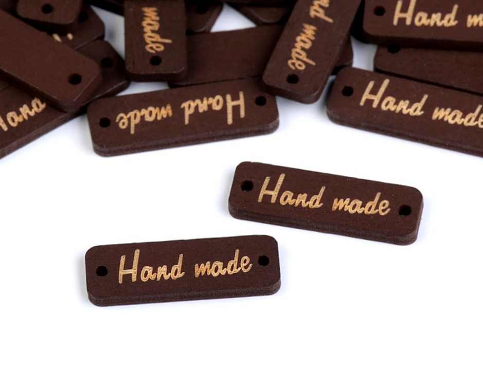 Dřevěnou cedulku obdélníkového tvaru se zaoblenými rohy zdobí jednostranný nápis "hand made". Po stranách jsou dírky, kterými lze provléct šňůrku, případně přišít k podkladu.