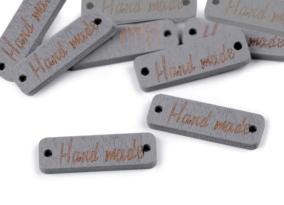 Dřevěnou cedulku obdélníkového tvaru se zaoblenými rohy zdobí jednostranný nápis "hand made". Po stranách jsou dírky, kterými lze provléct šňůrku, případně přišít k podkladu.