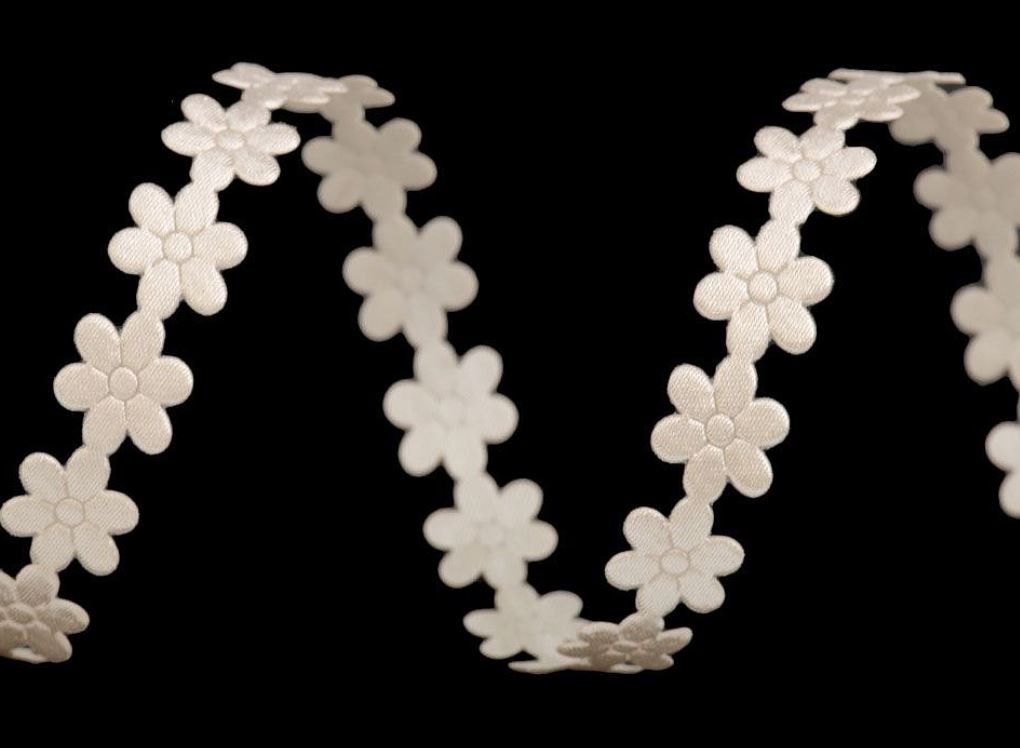 Saténový prýmek s drobnými květy je vhodný k šití i k dekorování.