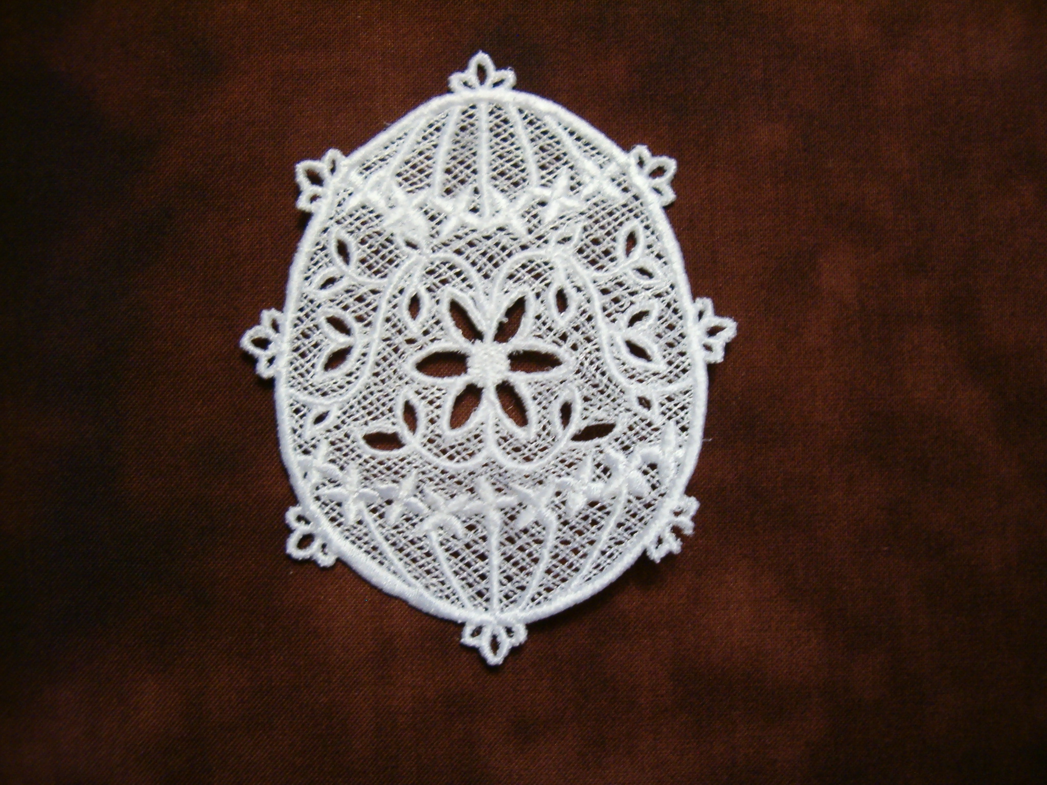 Jedná se o produkt strojového vyšívání, tzv. strojová krajka. Výšivka je cca 10 cm vysoká se šňůrkou na zavěšení.