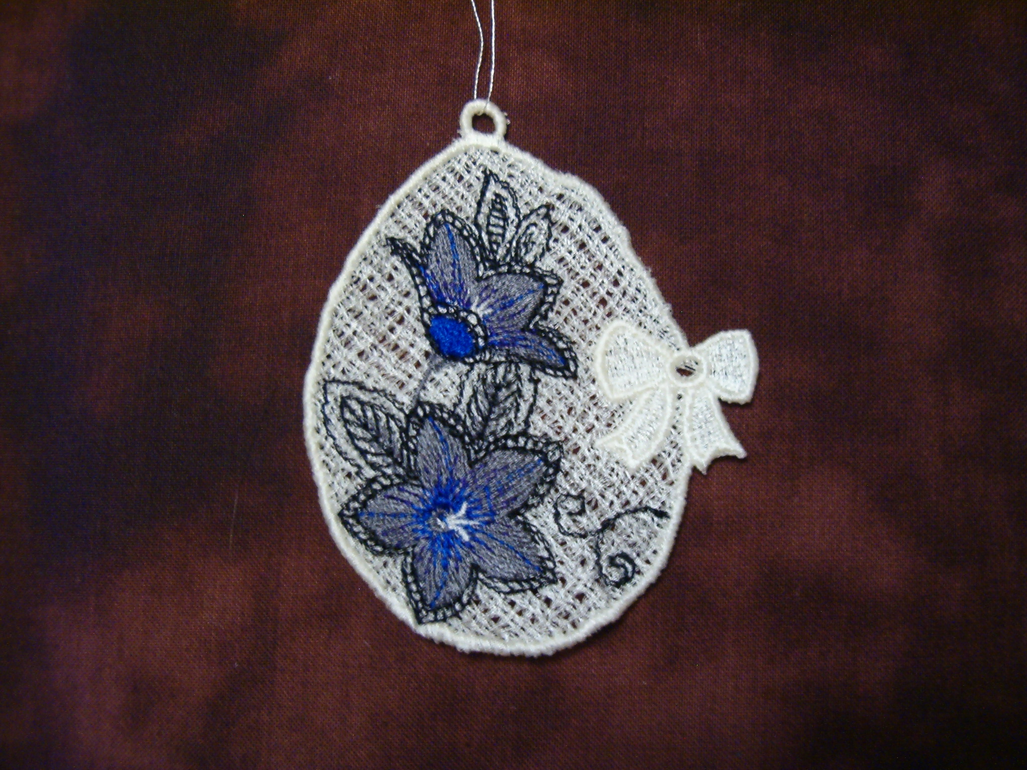 Jedná se o produkt strojového vyšívání, tzv. strojová krajka. Výšivka je cca 10 cm vysoká se šňůrkou na zavěšení.