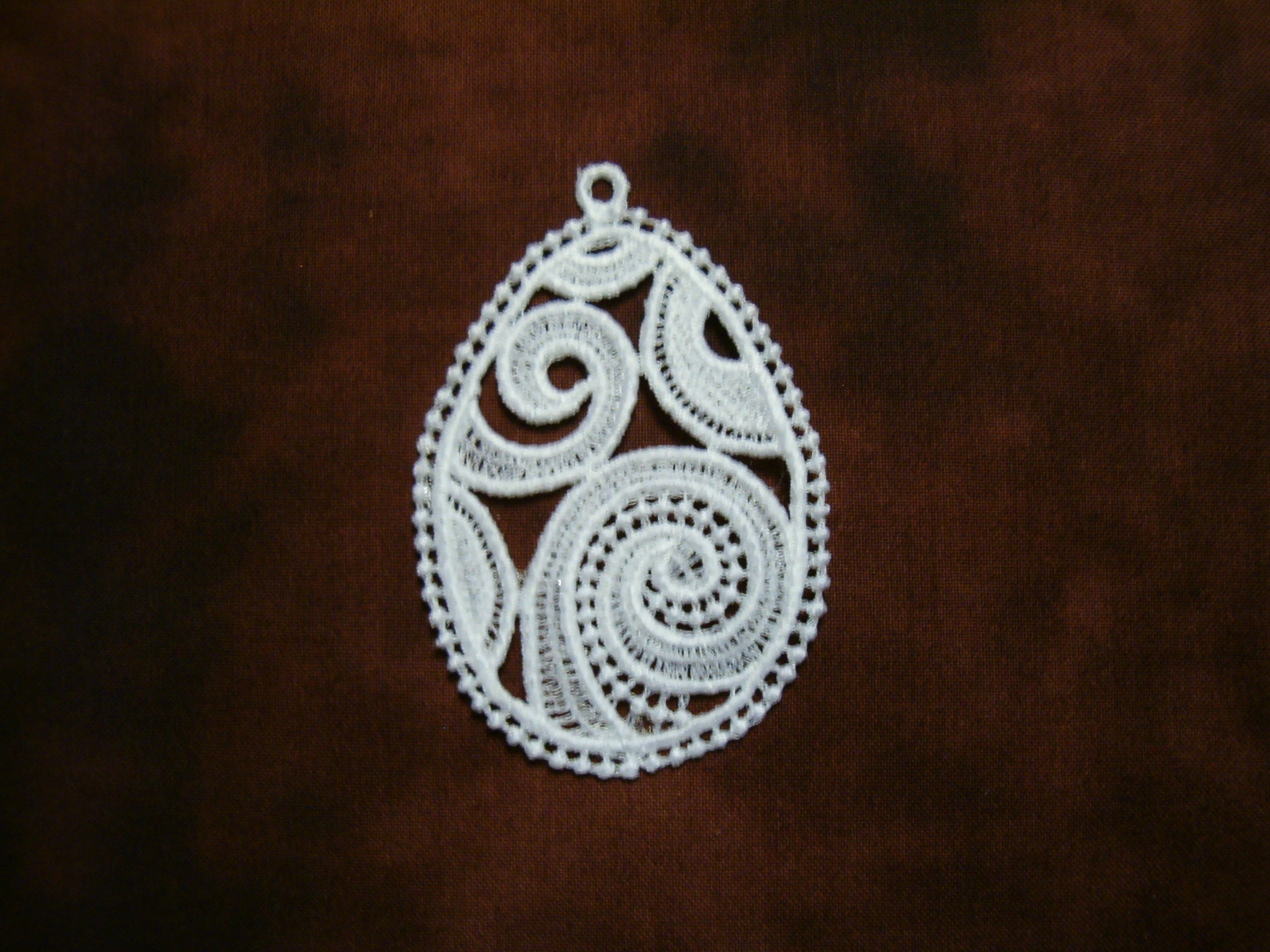 Jedná se o produkt strojového vyšívání, tzv. strojová krajka. Výšivka je cca 7 cm vysoká se šňůrkou na zavěšení.