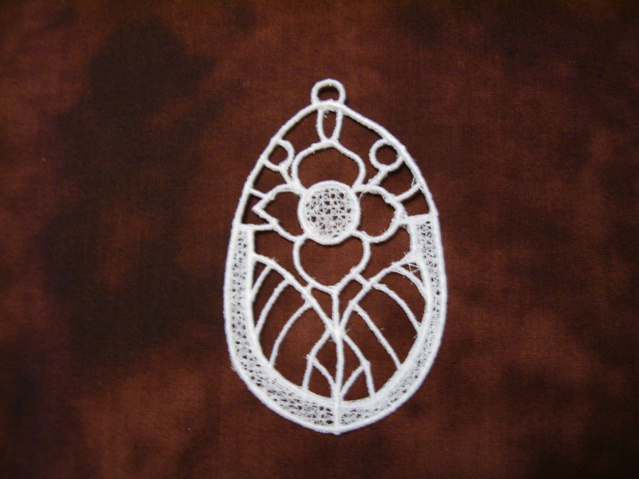 Jedná se o produkt strojového vyšívání, tzv. strojová krajka. Výšivka je cca 10 cm vysoká se šňůrkou na zavěšení.