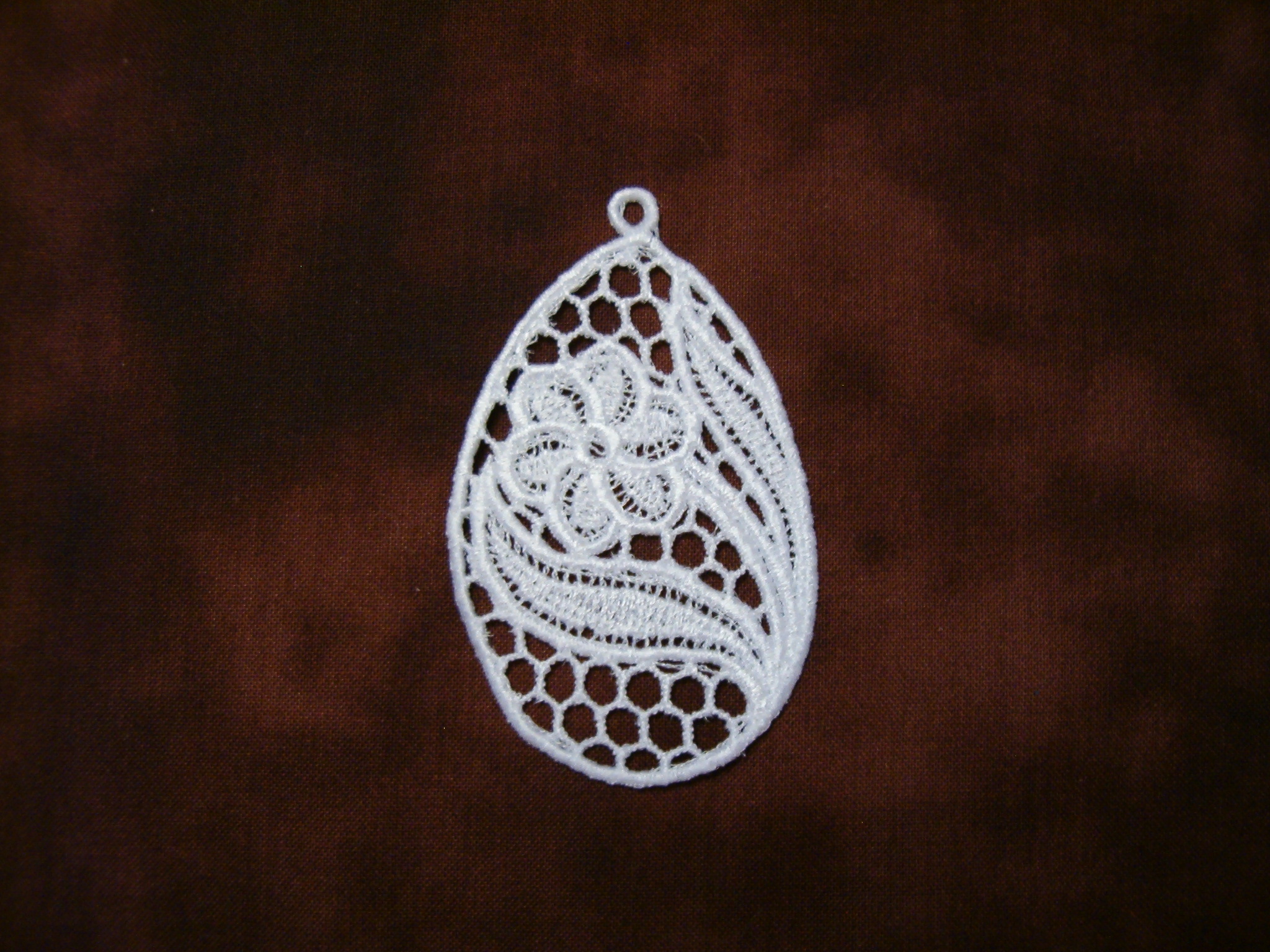 Jedná se o produkt strojového vyšívání, tzv. strojová krajka. Výšivka je cca 7 cm vysoká se šňůrkou na zavěšení.