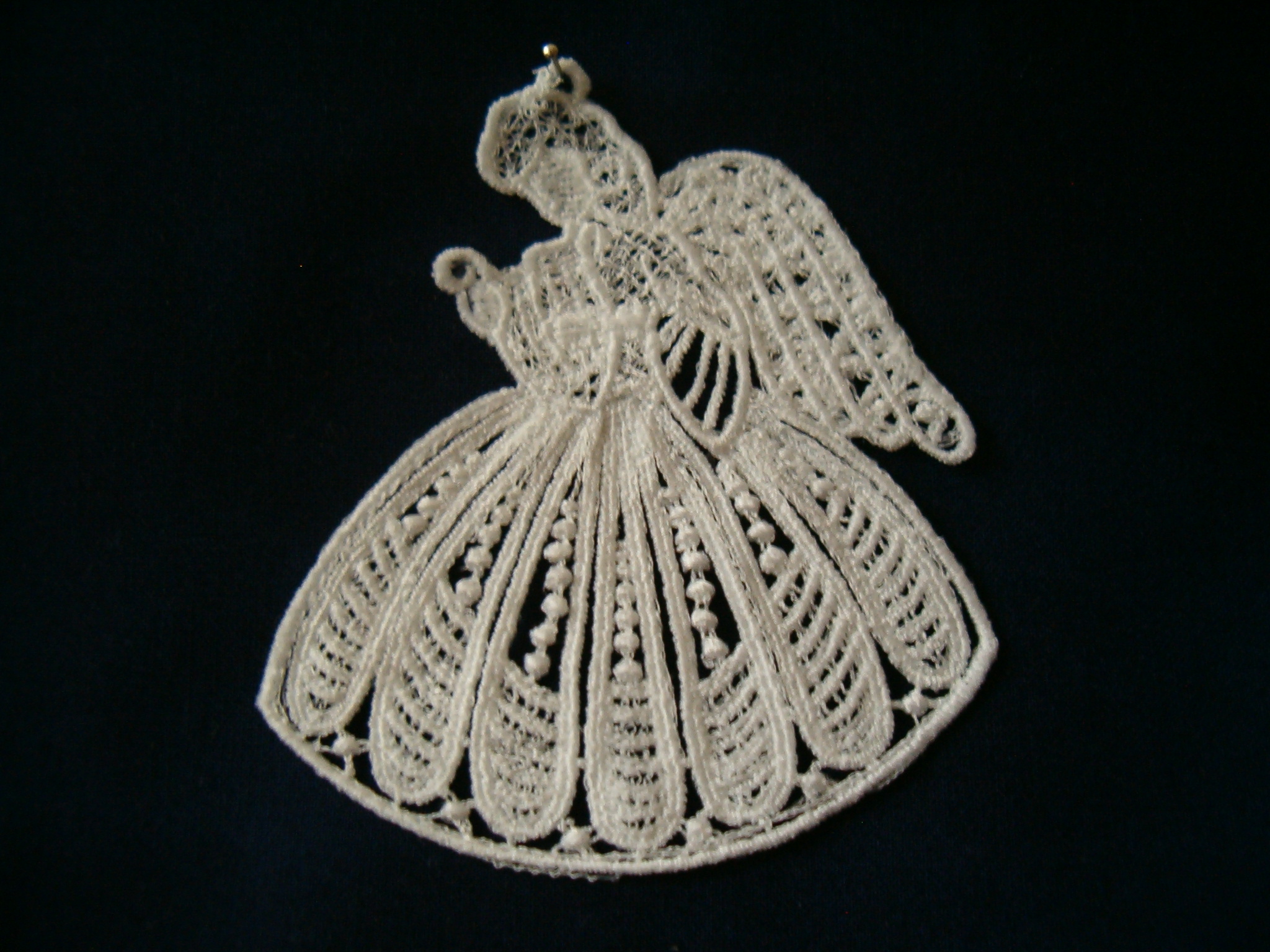 Jedná se o produkt strojového vyšívání, tzv. strojová krajka. Výšivka je cca 10 cm vysoká se šňůrkou na zavěšení.