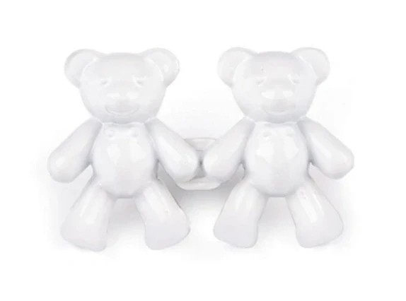 Ozdobné kovové zapínání s medvídky se skládá ze dvou částí, které do sebe zaháknete. Dá se opakovaně používat bez nutnosti přišití, protože má praktické jednobodové připnutí jako odznak. Poslouží tak i jako designový zkracovač v pase kalhot nebo sukní.