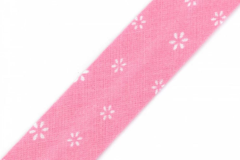 Bavlněný šikmý proužek s motivy jemných květů je pevný a zažehlený. Po našití má poloviční šíři tzn., že tento proužek bude mít po našití šíři 10 mm.