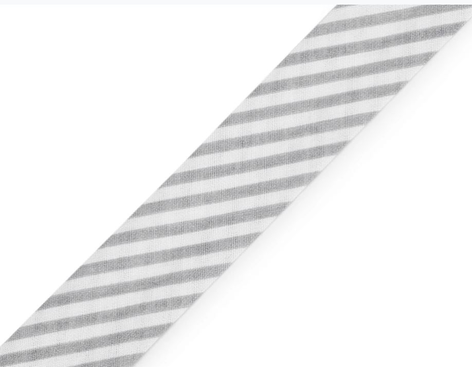 Bavlněný šikmý proužek s proužky je pevný a zažehlený. Po našití má poloviční šíři tzn., že tento proužek bude mít po našití šíři 10 mm.